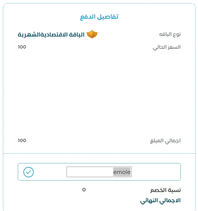 حيث سيحصل التاجر عند الاشتراك في الباقة الشهرية خصم 10% وفي الباقة السنوية خصم 20% بعد الضغط على علامة الصح الموجودة في اليسار والضغط على زر التوجه للدفع الموجود في الاسفل بعدها سيتنقل التاجر الى صفحة الدفع لإكمال الدفع وبعد اكمال الدفع سيتم اضافة التاجر تحت اسم المسوق.