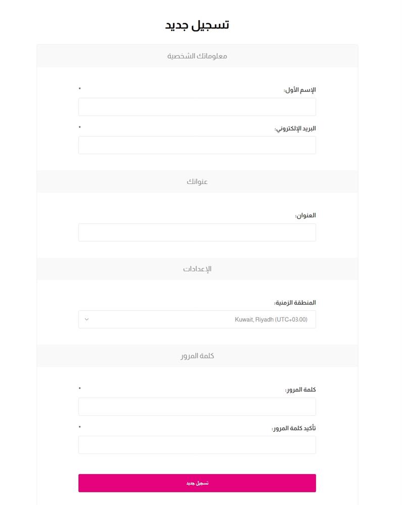 2- يتم تعبئة البيانات الموجودة في نموذج التسجيل وهي الاسم والبريد الالكتروني والعنوان وكلمة المرور كما في الصورة.